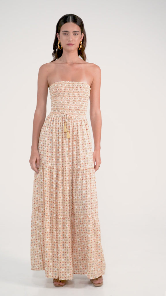 Baseema Maxi Dress is made on the tranquil island of Bali from lightweight rayon with a shirred bodice and tassel ornament at the front waist, then falls to a flowy A-line skirt. Morrato always strikes the right balance between statement and chic. Complement yours with simple strappy heels and gold hoop earrings.